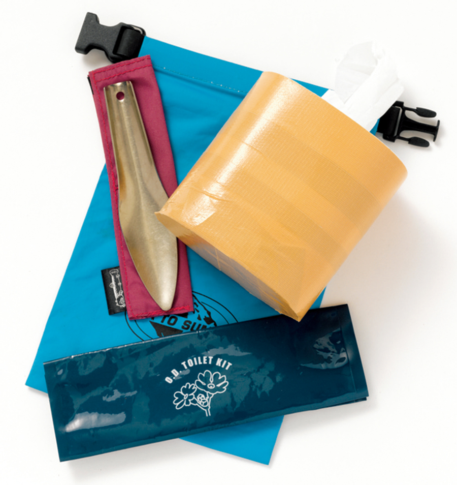 トイレットペーパーは濡れに弱い。そこで表面にガムテープを巻いて防水するといい。ペーパーは中央から引き出して使う。一方の底面にも張っておくと、湿った場所にも置ける。これをメインに小型ショベルと携帯トイレをひとつのドライバッグに入れておくと、どんな場所/状況でも安心なトイレセットのできあがり。