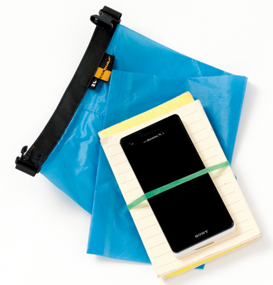 スマートフォンは専用ケースを使ってもいいが、文庫本にはさみ、ドライバッグに入れると、破損と濡れを同時に防げる。