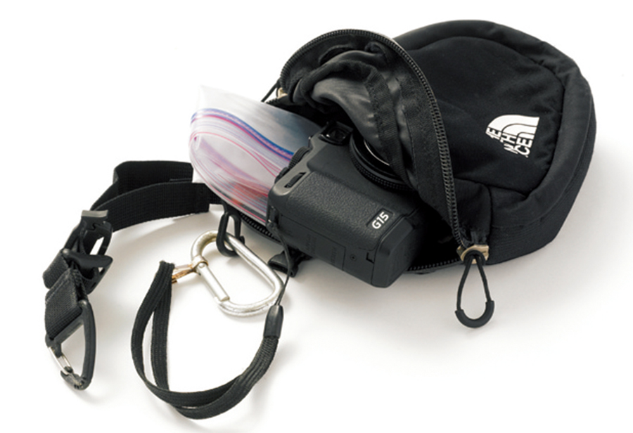 胸のアクセサリーポケットにはカメラを入れると使いやすい。利き手の反対側につけるとラクに手が伸ばせ、すぐに取り出せる。脱落防止にストラップで固定し、内部に防水性の袋も入れて水濡れ対策も万全に。