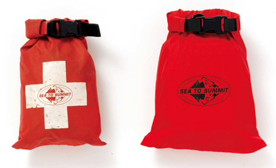 絆創膏や薬などの濡れると困るものは、やはりドライバッグに。これはかさばりよりもつぶれないことを重視し、内部のものは薄いフォーム材などのパッドで包む。自分以外の人でもひと目でわかるように、色は赤がおすすめ。貴重品も目立つ赤い収納袋ならば、紛失しにくい。