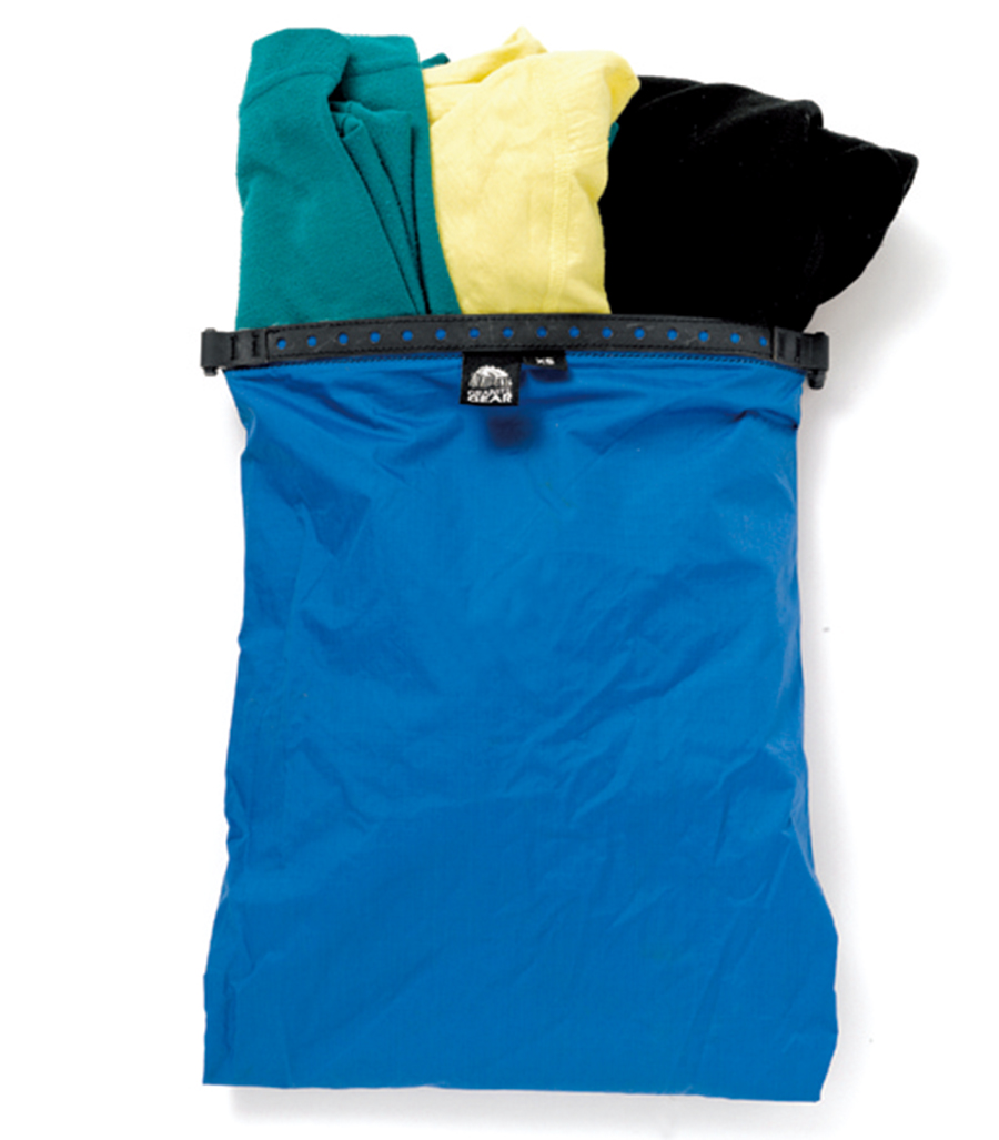 着替えの濡れの防止にはドライバッグが簡単。ただしウエアをきれいに入れないと、ドライバッグは圧縮しにくいので注意したい。レインウエアは失くしやすいスタッフバッグを使わず、下の写真のようにたたむ。たとえ雨の後の濡れた状態であっても、これならフード内に大半の水がたまり、ほかのものに濡れが移る量が非常に少なくなる。