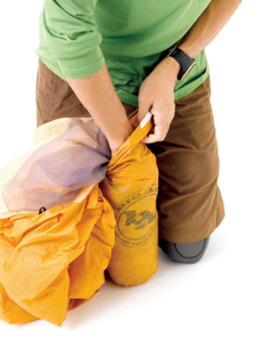 寝袋はかさばる装備だ。だが一方で非常に圧縮することができ、かつ絶対に濡らしたくないものでもある。コンプレッションバッグを使うのもいいが、防水性が劣るため、ドライバッグによる圧縮をすすめたい。その方法は下の通り。ドライバッグは空気も通さないので、しっかり圧縮さえしてから口を閉じれば、再び空気でふくらむことはない。