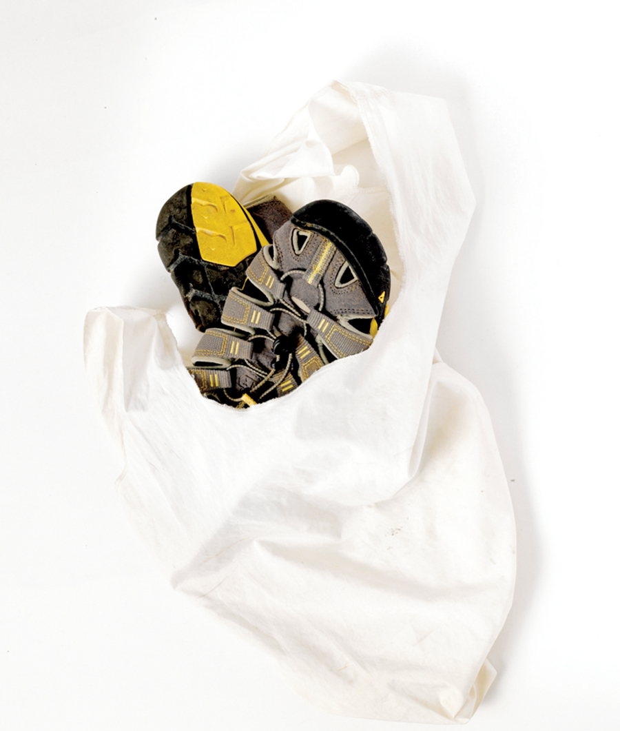 サンダルをバックパックに外付けする人は多いが、これは後述するようにとても危険。大きいものではないのだから、バックパック内部にしまいたい。その際の袋は「薄い生地で洗える」素材のトートバッグがおすすめ。行き帰りのクルマやバスでは履き替えた大きなブーツも入れられるし、汚れたらすぐに洗える。