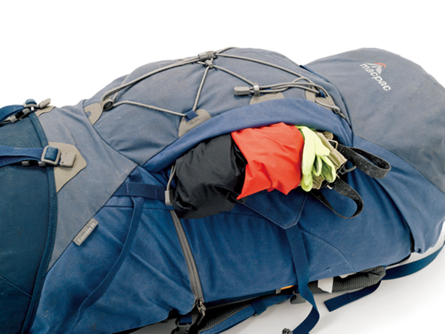 到着まで使わないものは奥にしまい、行動中に使うものや緊急時に必要なものは、取り出しやすい場所に入れておく。これがパッキングの大前提。バックパックはモデルよって細部が大きく異なるため、右の写真はあくまでも一例だ。雨蓋部分をわざわざ外さなくても必要物が出せるようにパッキングをしておくと手間がかからず、時間も無駄にしない。