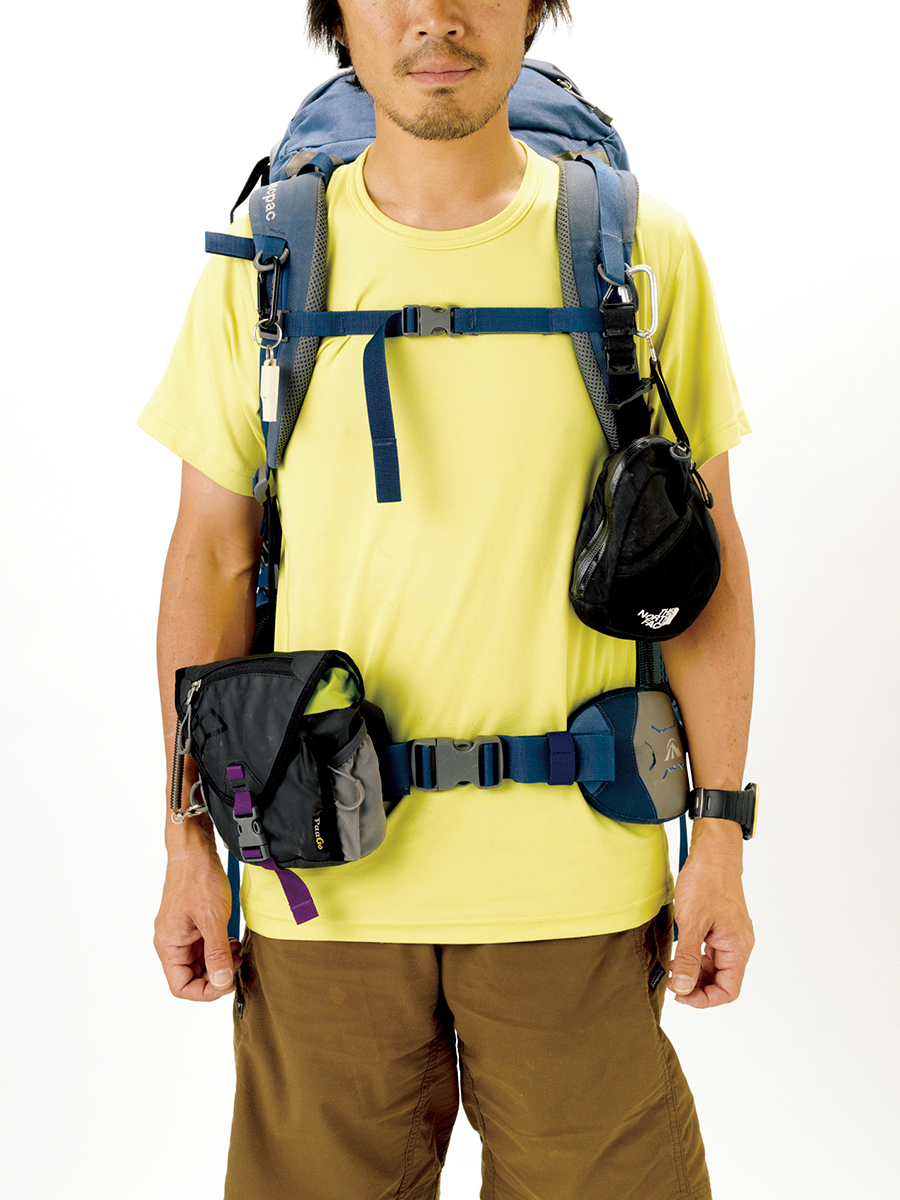 腰のポケットには地図やGPSなど。マップケースを使わず、柔らかな防水性の袋に地図を入れ、小さめに折りたたんで入れておくのもよい方法だ。