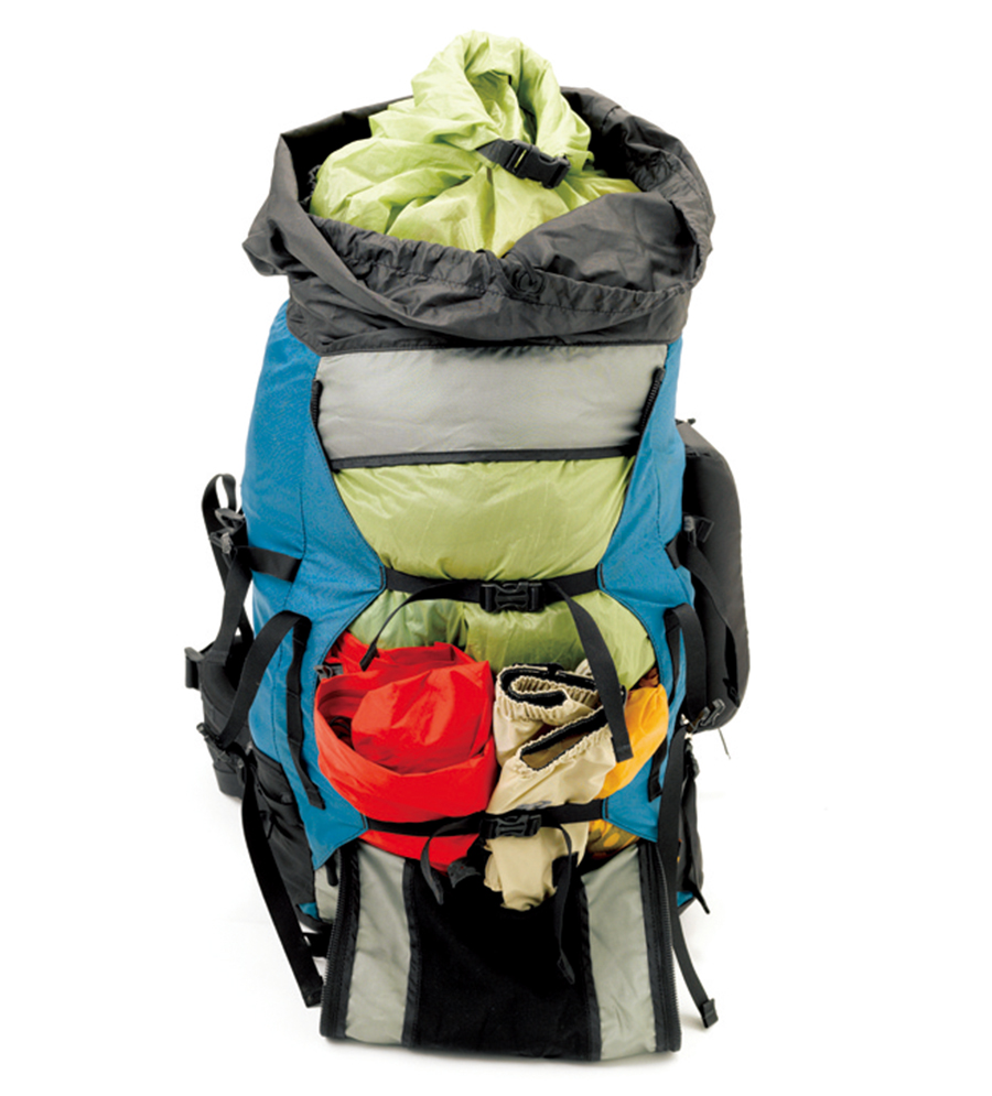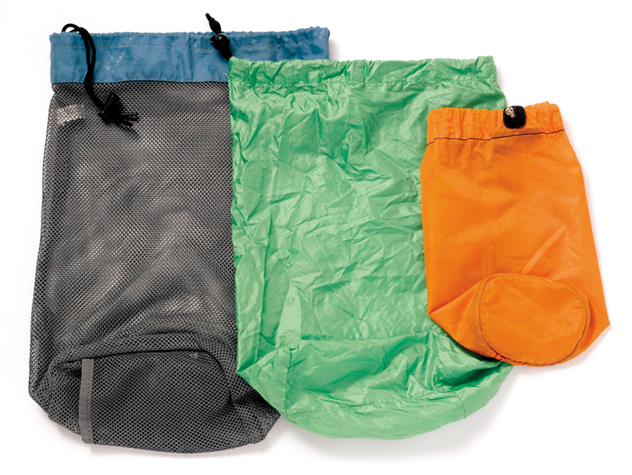各種スタッフバッグを使えば細かな荷物の整理ができ、コンパクトなパッキングを目指すのにも役立つ。ただし、大きいものは内部の荷物が安定しないので、小型のものをたくさん用意しよう。バックパック内では容量1 ~ 8ℓほどが使いやすく、大きくても15ℓ程度があれば充分だ。それぞれの防水性、通気性などの持ち味も考えて選びたい。