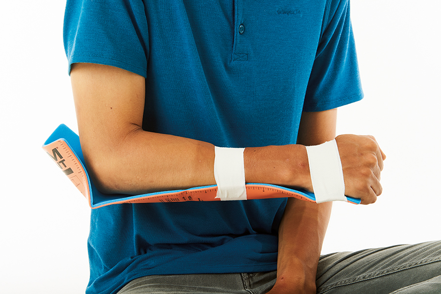 短くしたサムスプリントを腕に沿わせて、患部を避けてテーピングで固定する。このときに腕が鬱血しないように、巻きつける強さには注意が必要だ。