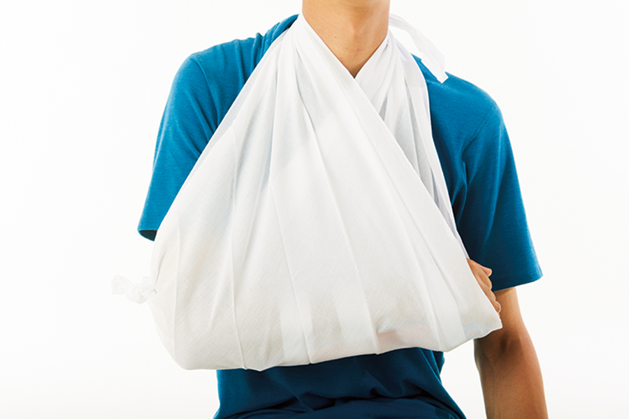 痛みがひどい場合は三角巾を使用して腕を吊る。患部をさらに安静にできるのだ。三角巾の長さや腕を吊る角度は、ラクな状態になるように調整しよう。