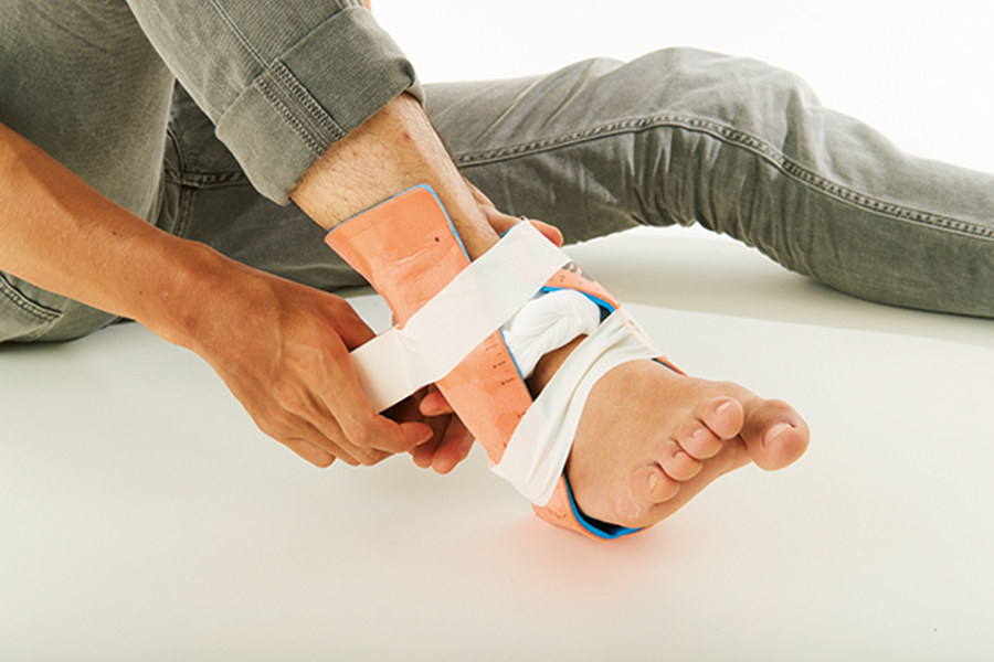2. さらに固定する必要性を感じたので、足首を左右から挟むようにサムスプリントを使用して、足の形に合わせて形状を変化させた。