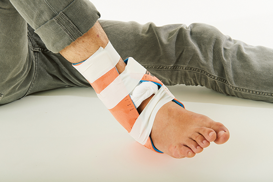 3. 最後にテーピングでサムスプリントを足首に固定した。患部を避けるように、上2カ所、下1カ所で巻きつけた。