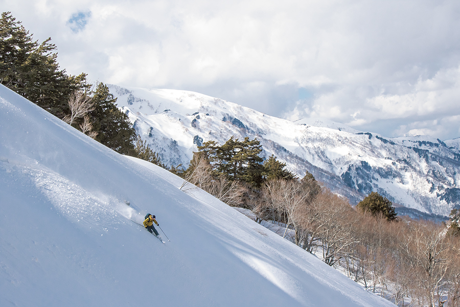 蓮華温泉周辺の心地よい斜面を滑走する中野豊和。この日は標高をあまり上げず、このまま露天風呂に滑り込んでいった。