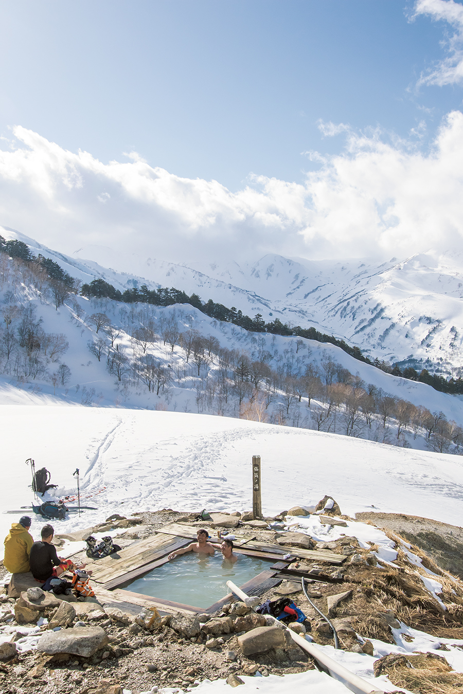 3,000m級の山々をバックにして、広大な斜面での滑走。そのあとは美味いメシと酒をいただき、ヘッドランプを灯して山中に沸く露天風呂へ。星空に囲まれながらの雪見風呂に浸かるスキートリップを目指して蓮華温泉へと向かった。