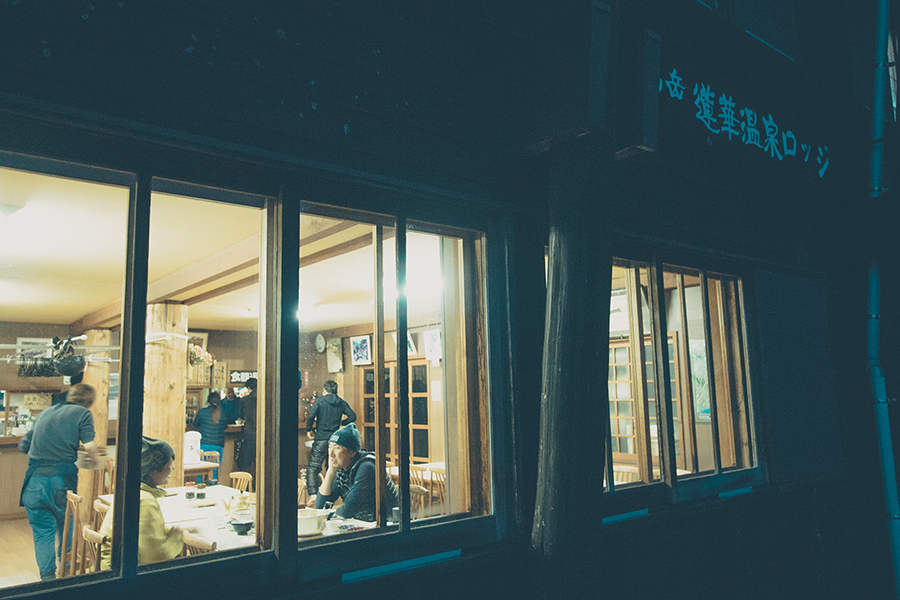 ガラガラと木扉を開けると、蓮華温泉の御主人、田原伸男さんが温かな笑顔とともに出迎えてくれた。降雪の勢いが増してきたので、楽しみにしていた露天風呂は諦めて内風呂で汗を流すことにする。