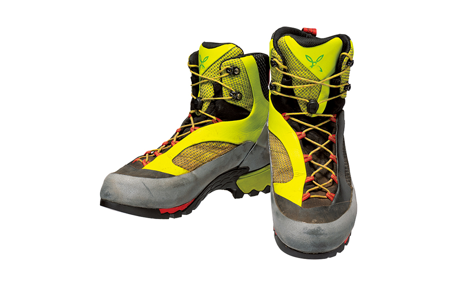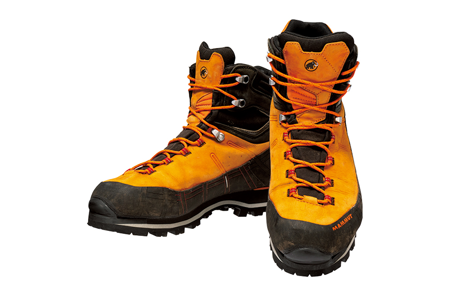 ❶B+Ⅲ+b❷穂高、槍、剱など岩場の山域で、夏から寒くなる前の季節で短めのテント泊か小屋泊取材のときに。❸軽くて滑りにくく、ある程度の剛性もあるところ。しゃがむことが多い撮影ではバランスのよさも気に入っている。❹岩場がメインの山で使う靴は少し小さめを選ぶ。カカトのホールド感があり、指まわりが窮屈でない靴が好み。