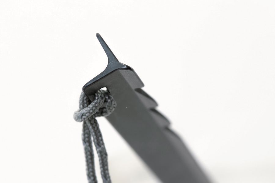 アルミ合金のペグは驚くべき軽量さ。3段階にわたってミゾが刻まれ、たとえペグが根元まで突き刺さらない状況でもガイラインを地面近くで固定できる。プルコードには反射素材も織り込んだ。