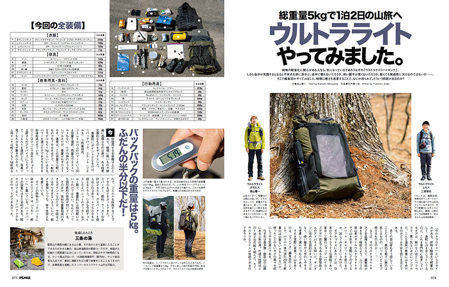 山行スタイルに合わせて装備を軽くするためのテクニックを披露している『PEAKS』5月号「軽量化の極意」。