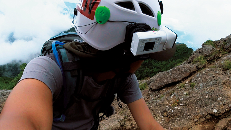 危険な場所だと操作中に機材を落とすという可能性もあるので、そのような場所では始めから撮影を諦めるか、アクションカムをヘルメットやバックパックなどに付けて撮っています。