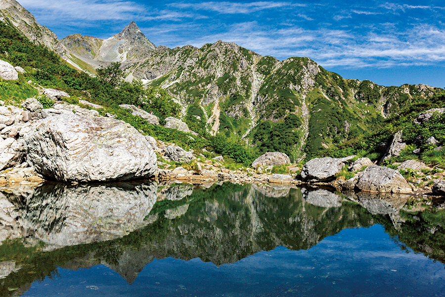 水面への被写体の映り込み。風景写真では常套手段であるが、水辺の少ない山岳エリアにあってはかなりレアなスポットだ。しかも天狗池は槍ヶ岳までの距離感もよく、位置関係も申し分ない。撮影条件としては順光がベスト。