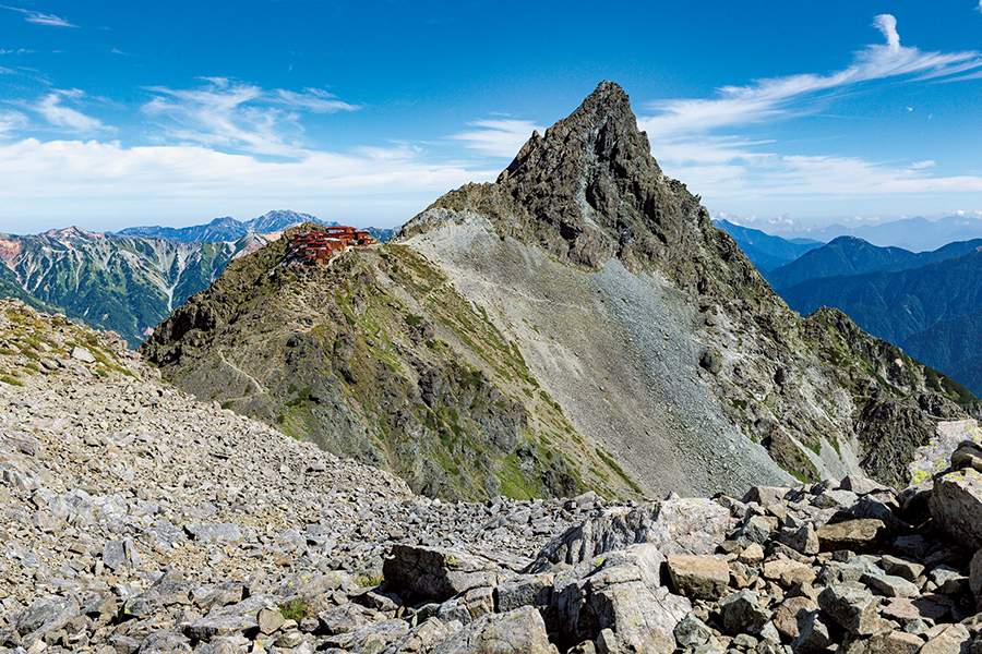 ほどよい距離感で槍ヶ岳と向き合うことができ、大喰岳の標高も3,101mと、槍ヶ岳と同じくらいの高さとなる。写真を撮るならパースがつきにくく見た目どおりに表現できる。標準(50㎜)レンズくらいの焦点距離が立体感が出ていいだろう。