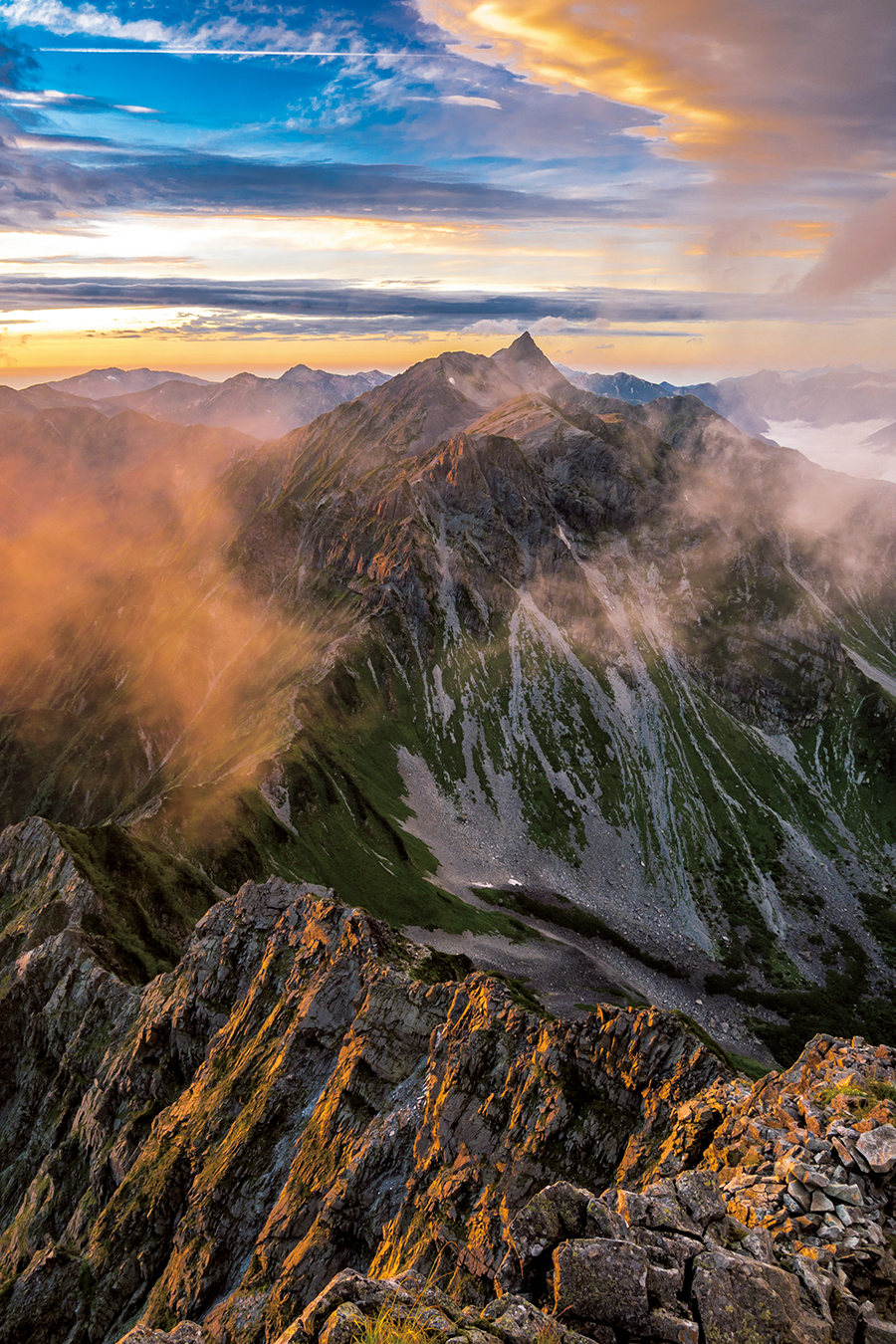 朝は右側からの光が陰影のエッジを際立たせてくれる。これは雨のなか大キレットを越えてきた日のもの。日没と同時に槍の穂先が姿を見せてくれ、残照に染まる岩肌とガスの名残が演出してくれた。天候回復時はチャンスだ。