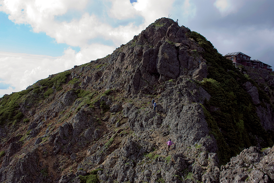 権現岳山頂は狭い岩塔で2 ~ 3人ずつしか立てず、岩塔の下の広場のほうがのんびりできる。続くギボシ、西ギボシも足場が悪く、稜線直下を巻いてクサリ場を通過する。続く急斜面のガレ場を下ってノロシバをすぎると、林のなかに入って青年小屋に着く。ここからは悪路はなく、緊張を解いてフィナーレを楽しめる。