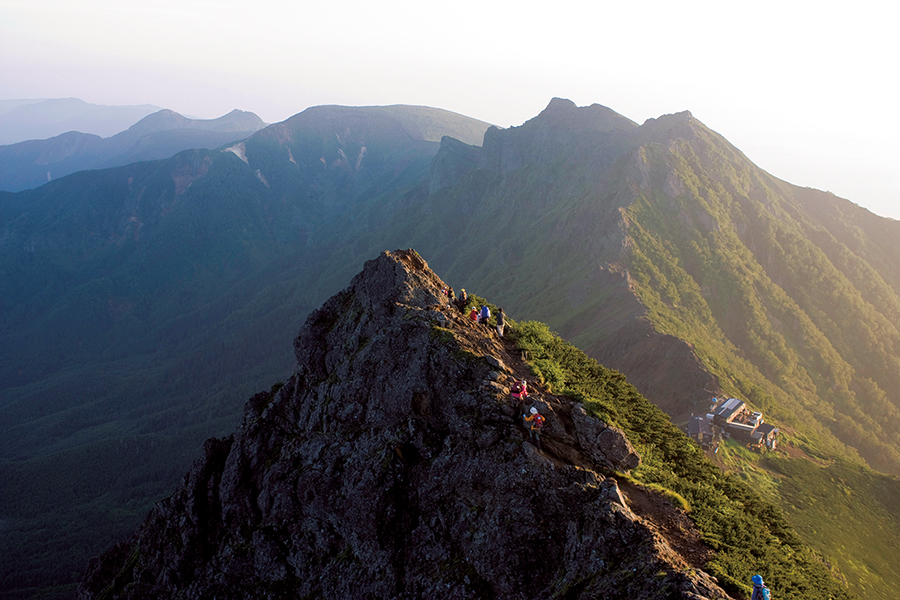 主稜線に合流する直前の1 ~ 2時間の区間が核心部になる。急峻な岩場のなかにあるルートは踏み跡が不十分なため不安定で、より慎重な足さばきが必要だ。