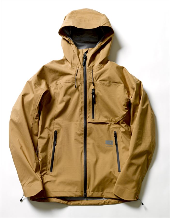 やわらかな3レイヤーの防水透湿素材を使用したレインジャケット。アジア人の体型にフィットするパターンで、行動中もストレスが少ない。カラーは全2色(ビスケット、ミッドナイトブルー)。重量398g(サイズL)