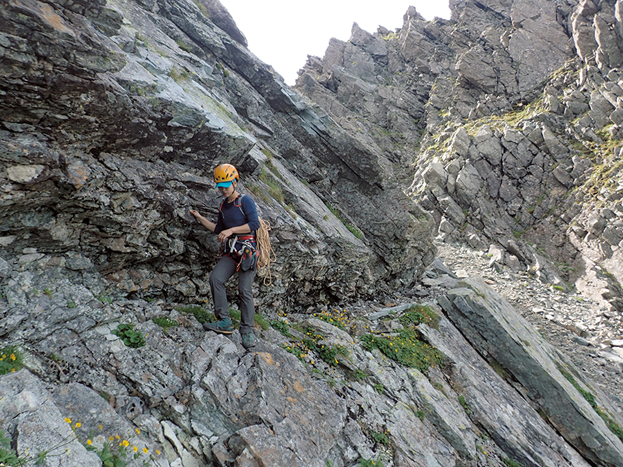 「中央ルート」と「左ルート」は見るからに脆そうである。迷わず「右ルート」を登ることにしてロープを結び、クライミングシューズに履き替えて登り始めた。簡単なクライミングでコルに達し、さらにロープを延ばして途中のテラスでピッチを切った。