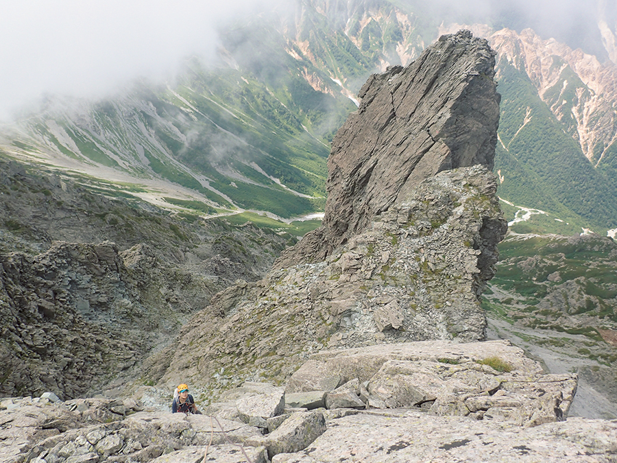 コルまで懸垂し、曽孫槍を登る。見た目どおり浮き石が多い。ロープが当たっただけで落石を起こしそうである。うかつにプロテクションをセットすれば岩ごと吹っ飛んでしまうだろう。岩の脆ささえ気をつければ落ちる箇所ではない。そういい聞かせて細心の注意を払いながら登った。孫槍からは岩が硬くなり、傾斜の緩いスラブをぐいぐい登ることができた。振り返ると背後に小槍が大きくそびえ立っていた。私たち以外に人っこひとりいない。まさに雲上の爽快クライミングである。2ピッチで鋭く尖った孫槍の頂上に到着した。