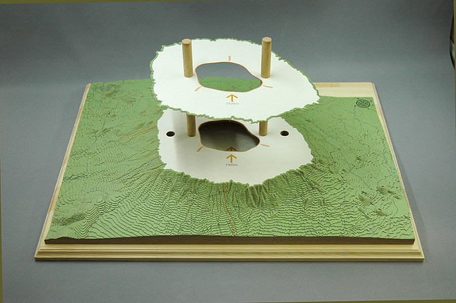 裁断済の紙を積み上げて作るやまつみ。完成品は精巧な模型となり、3Dで山並みを堪能できる。この「穂高連峰」は常念山脈や笠ヶ岳なども含まれており、各地点から槍ヶ岳がどのように見えるかわかりやすい。より範囲が狭く、短い時間で制作しやすい「穂高・槍」もある。