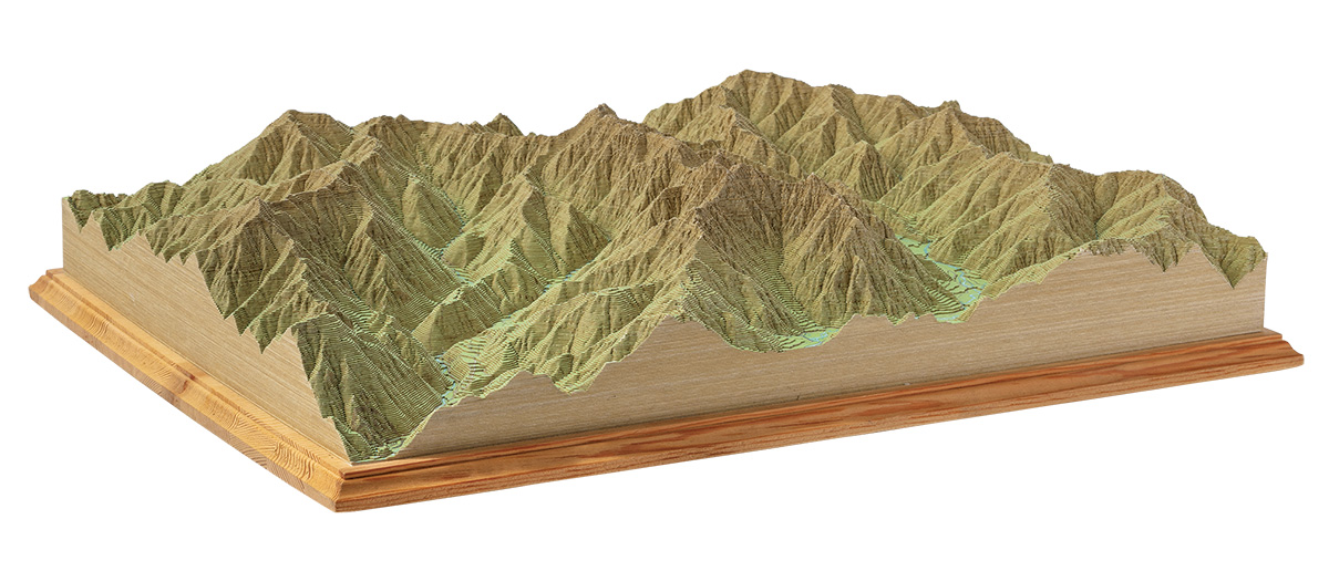 裁断済の紙を積み上げて作るやまつみ。完成品は精巧な模型となり、3Dで山並みを堪能できる。この「穂高連峰」は常念山脈や笠ヶ岳なども含まれており、各地点から槍ヶ岳がどのように見えるかわかりやすい。より範囲が狭く、短い時間で制作しやすい「穂高・槍」もある。