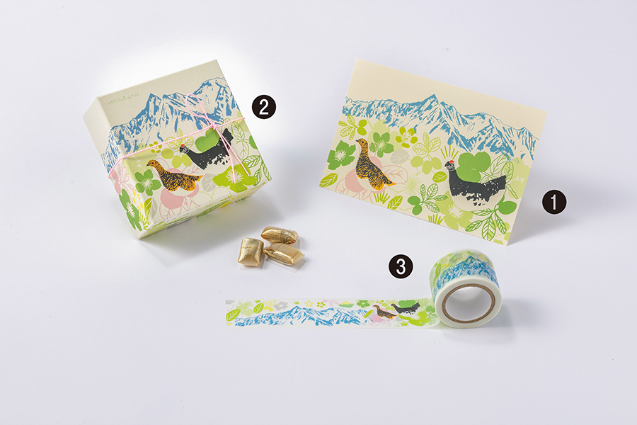 山をモチーフにしたデザインのアイテムも多数展開するブランド「旅スル紙」。雷鳥と槍ヶ岳が描かれたグッズも人気で、こちらのポストカード、黒豆きなこ飴、マスキングテープは価格が手頃でプレゼントにもぴったり。黒豆きなこは控えめな甘さ、ゴールドに輝く飴の色(金箔は使っていない)がポイント。ネット販売のほか、松本のショップ「手仕事商會すぐり」などでも購入できる。