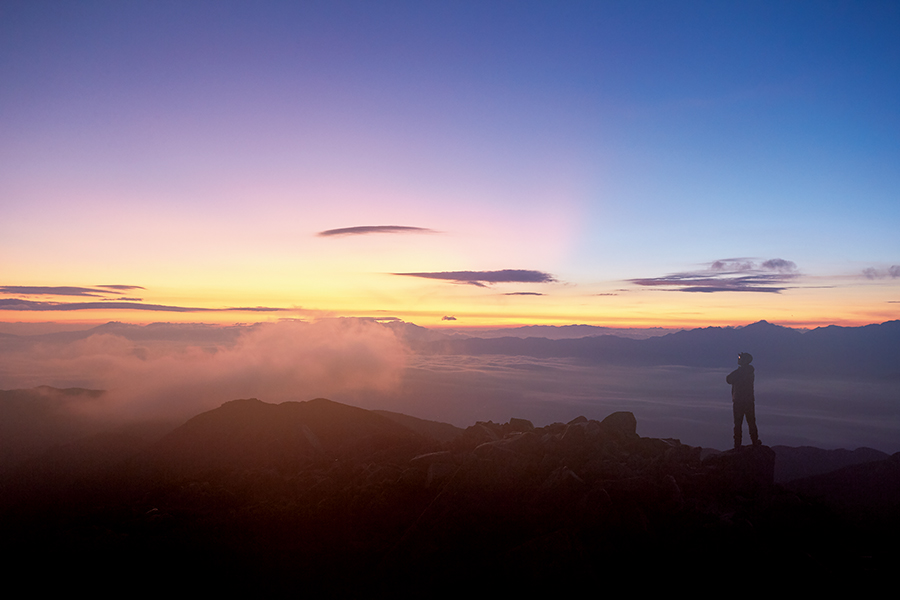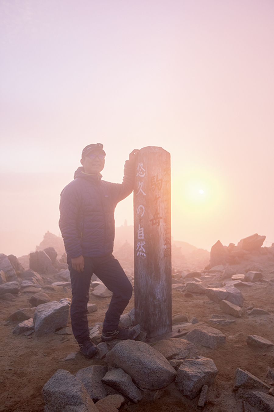 早朝、まだ薄暗い木曽駒ヶ岳の山頂に彼は立っていた。やがて夜の帳が徐々に上がり始め、雲海が柔らかな光に染まり出し、静寂を上塗りするように男の脳内にベートーヴェンの「歓喜の歌」がフェードイン。最高の朝が決まった瞬間だ。いったい今日はどんな素敵な時間を楽しめてしまうのか? ……そう男が浮かれてしまった瞬間、山腹から突然モクモクさんが大発生。カーテンを閉めるようにご来光が白いガスに飲み込まれ、先ほどまで優雅に流れていた歓喜の歌は一気に「運命」へと転調。あっという間に周囲は白い世界に包まれ、またひとつ男の前から夏が遠ざかってしまった。夏の恋心は気まぐれなのである。