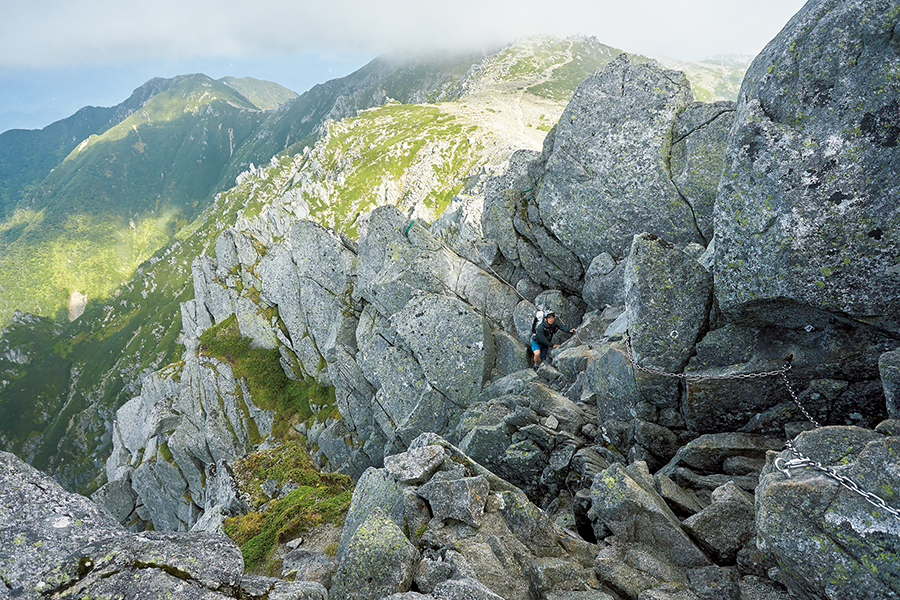 去りゆく夏を追いかけて宝剣岳を極楽平方面へと下降していく。鎖などで整備はされているが、岩場に不慣れな人は注意を。