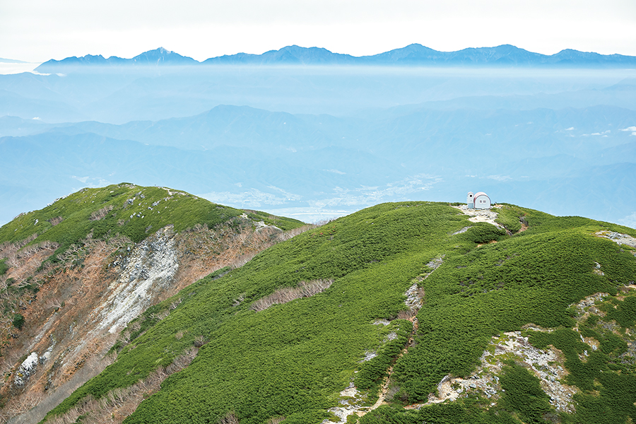童話に出てきそうな可愛い檜尾避難小屋と壮大な南アルプスの眺め。