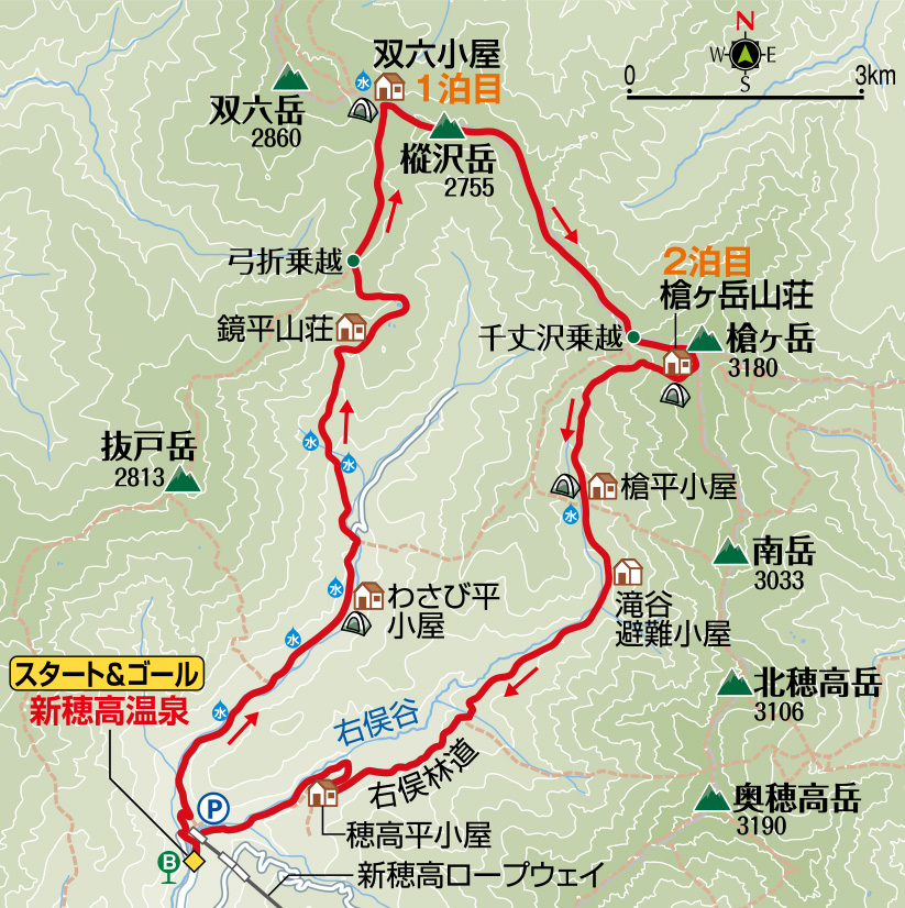 - 新穂高温泉〜わさび平小屋〜双六小屋〜千丈乗越〜槍ヶ岳山荘〜飛騨乗越〜槍平小屋〜新穂高温泉