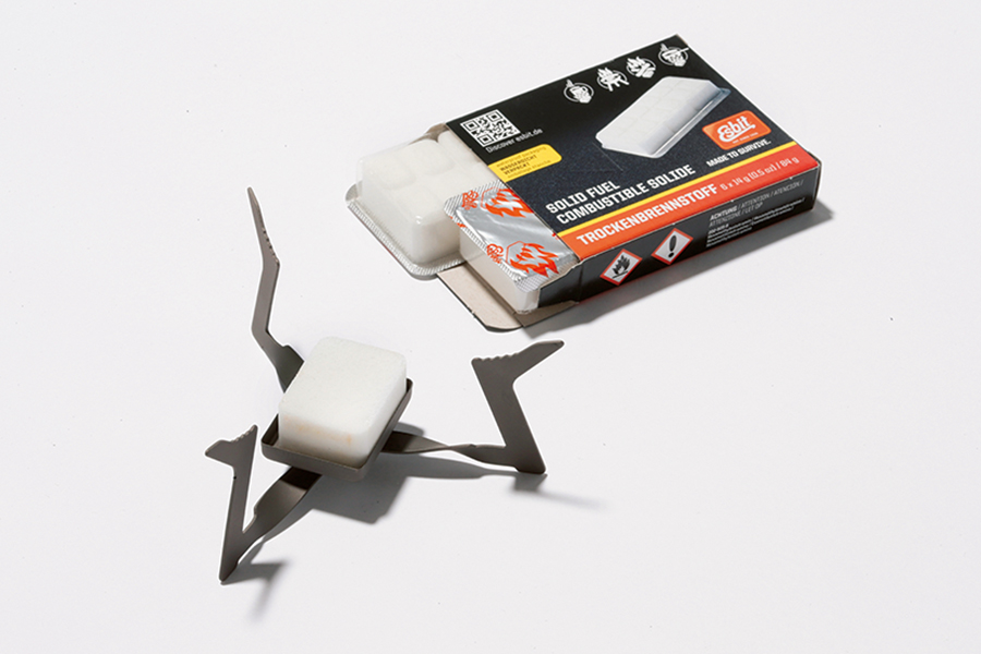 ULハイカーに愛用者が多いのが高山や氷点下でも安定して燃える固形燃料ストーブ。エスビットのタブレット(下)ならひとつで500㎖のお湯を沸かせる。