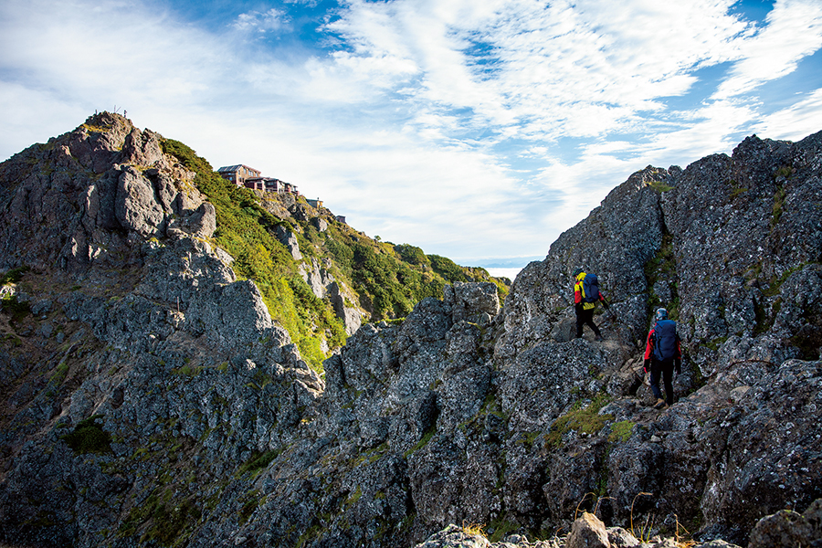 歩き出してすぐ、気を抜けない片斜面のガレ場が現れた。両手でしっかり体を支えて登ると、樹林帯から出たあたりで突然風が強くなってくる。だが、少しずつ気温が上がってくるのを背中で感じられた。そろそろ太陽が昇りそうだ。