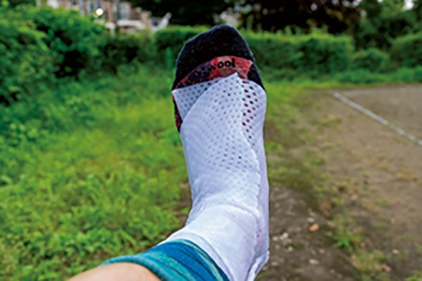 つま先側とふくらはぎ側の縁の部分にはテーピングで補強すれば固定力が格段に増す。少しきついがシューズも履ける。