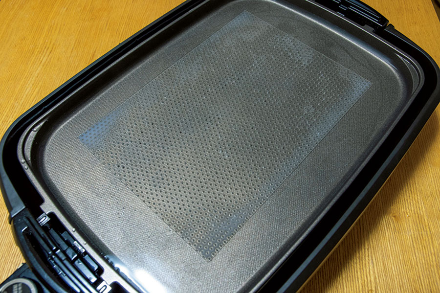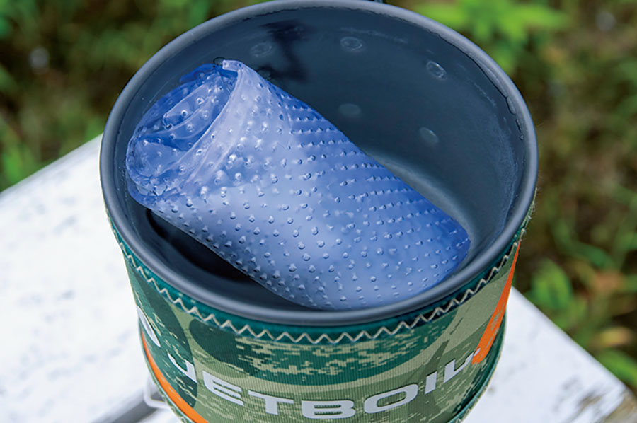 この熱可塑性樹脂シーネは、新品時はA4サイズ厚みが2mm程度の固い板状のため、そのままでは山行時に携行しにくいだけでなく、登山用のバーナー&クッカーに入れて熱加工できない。そのため負傷時に現場で使えるようにするためには、あらかじめ携帯しやすく、かつクッカーに入れられるサイズ、形状に加工しておく必要がある。そこで思いついたのは家庭用のホットプレートに水をはり、このシーネが軟化する65〜70°Cぐらいに温めて、携行 可能な状態に加工しておく作戦だ。