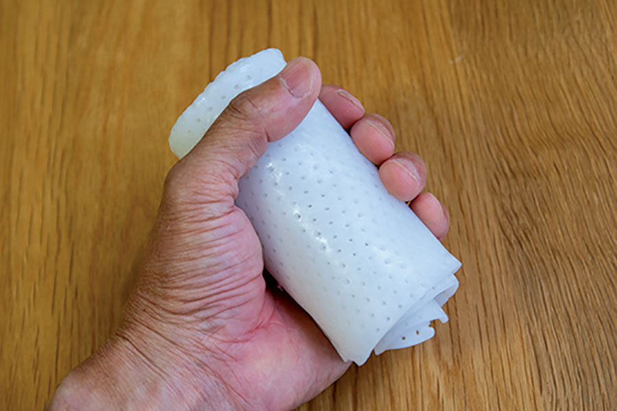 適温のお湯に浸け、やはり半透明になったところで、お湯からあげ、タオルなどで湯切り後、固定したい患部に巻きつけて加工する。再利用も可能。