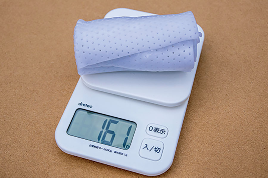 手早く水気を切り、短辺を2つ折りにして、くるくると丸める。冷めてくると乳白色に戻り、固まる。重さは161グラム。