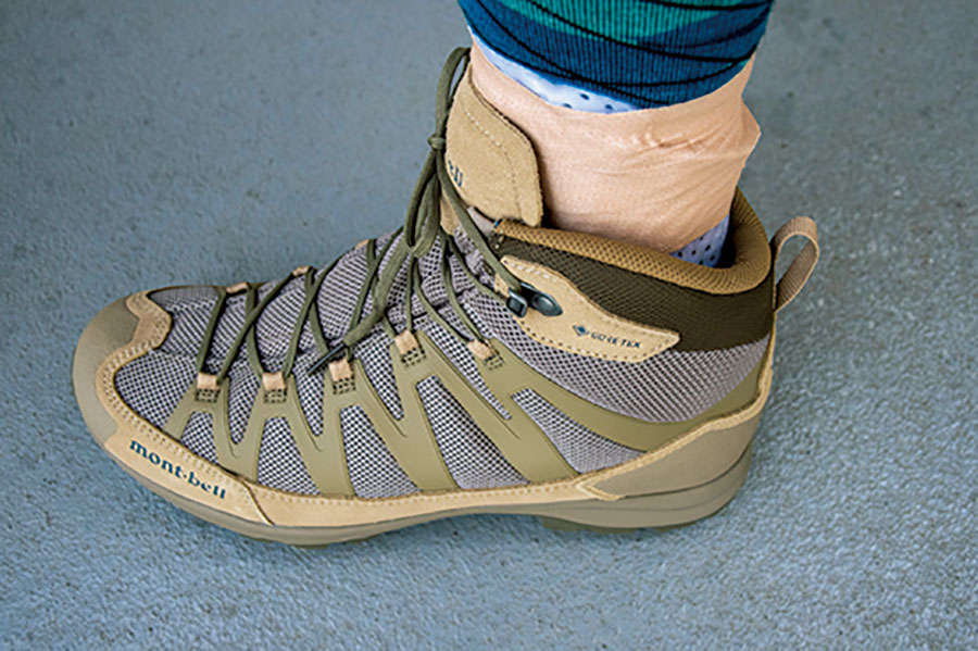 つま先側とふくらはぎ側の縁の部分にはテーピングで補強すれば固定力が格段に増す。少しきついがシューズも履ける。