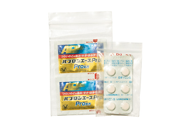 鎮痛剤、風邪薬、解熱、下痢止めを中心に医師と相談して自分に合ったものを装備する。