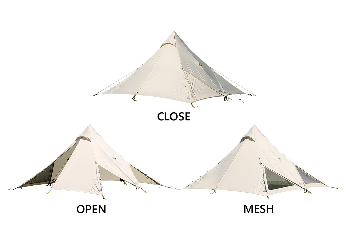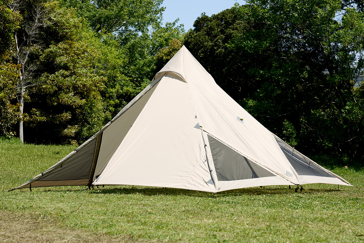 「HIDEOUT-01」は人気のHIDEOUTシリーズの中でもワンポール設営が可能なモデルです。美しい曲線を描くラウンドデザインと、シンプルなスタイルながらクローズ、オープン、メッシュにと変幻自在で、さらにダブルファスナーで多彩なアレンジが可能になっているのが魅力。自由なキャンプスタイルを叶えてくれます。