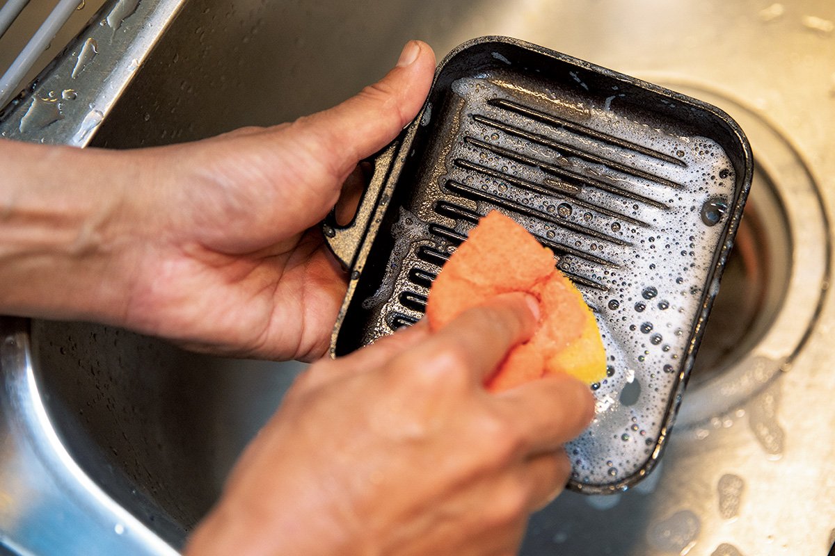 今回の付録は開封後すぐに使えるようシーズニング済みの状態で同梱されています。念のため出荷時の汚れなどを洗剤で落としてよく水洗いし、熱して水分を飛ばしてから食用オイルを塗って調理の準備を整えましょう。オイルは外側にもまんべんなく塗ること!
