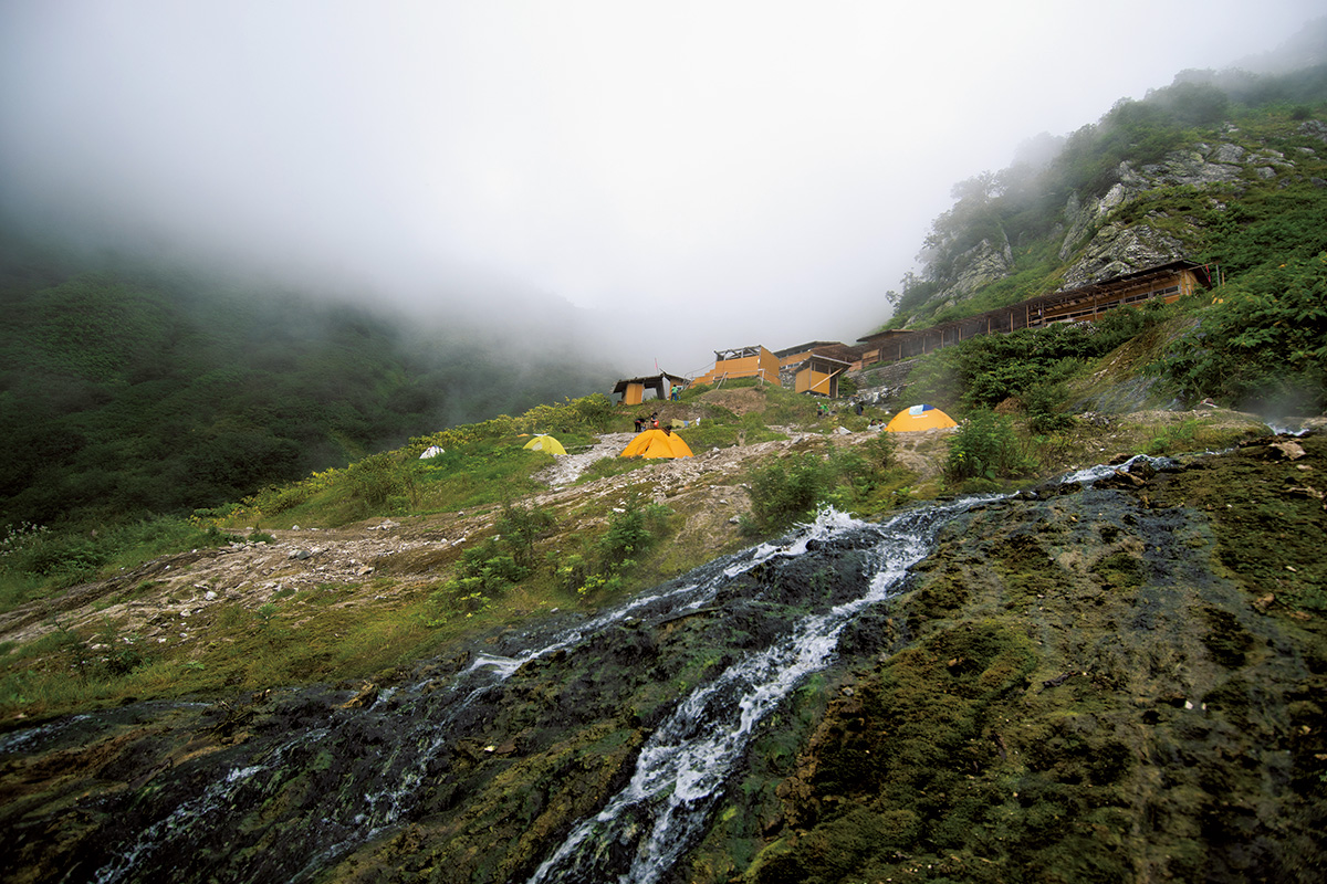 5時間も歩かないうちに、辺りに硫黄の匂いが立ち込みはじめ、期待が徐々に膨らむ。前方を見上げれば、湯気を纏った温泉が泉のように湧いている。奥には建物がうっすらと姿を現した。ここは桃源郷? 幻想的な風景に、つい自分の意識を疑ってしまう。