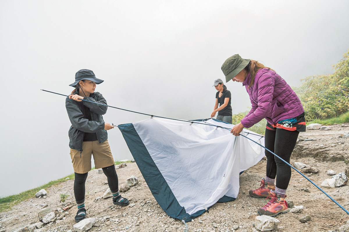 しほみんと有紀ちゃんにとっては初めてのテント設営。テント泊歴でいえばセンパイの私が率先して、張り方やテントの中のレイアウトをレクチャーしながら立てていく。ふたりとも興味津々という眼差しで、初めてのテント泊にウキウキしているようす。彼女たちにとって楽しい初体験となるように、しっかりアテンドしなければ。ちょっぴり責任重大だ。