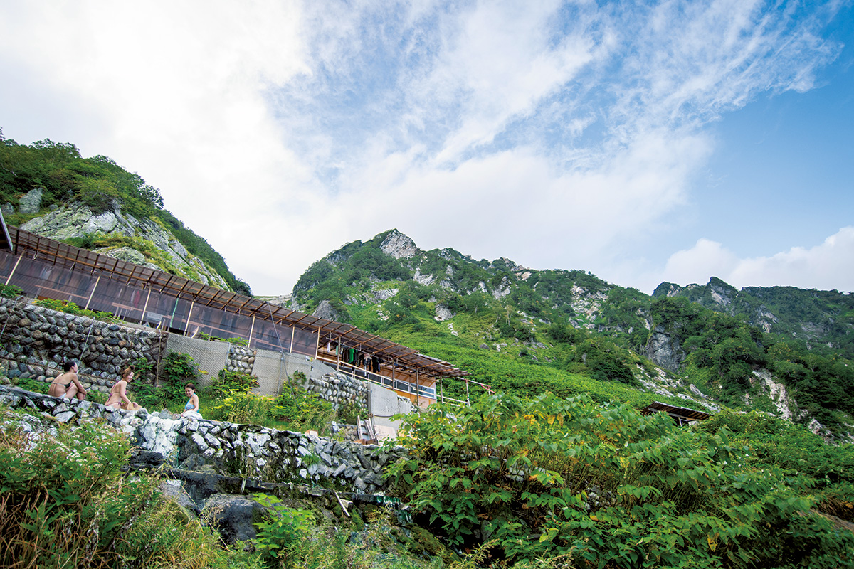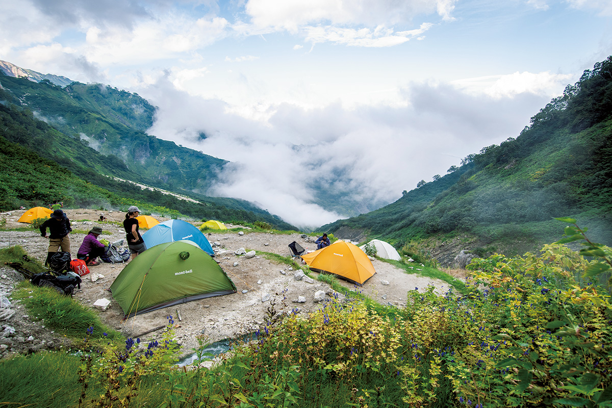 小屋の敷地内に突入すると、テント場の真上に裸の人たちが見える。そこには石造りの大きな露天風呂。あんなところに温泉を作ってしまうなんて。ああ早く、あそこからの景色を眺めてみたい——。早まる気持ちを抑えつつ、まずはみんなで寝床をこしらえなければならない。湯上りにはぐでぐでに気持ちよくなってしまって、すぐさま缶ビールに手が伸びてしまうことが目に見えているのだから。