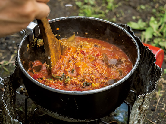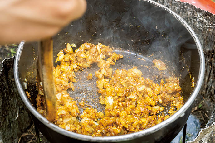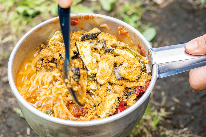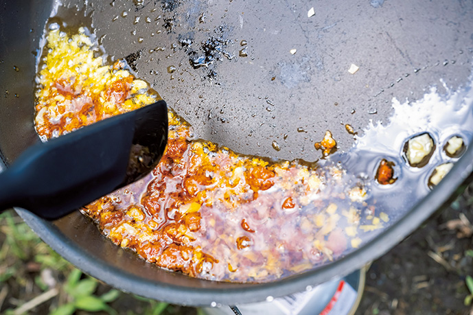 香味野菜スパイスを最初に炒めている香りで、すでに期待が高まりました。仲間との登山を想定しているとのこと。道具と食材を分担して背負えば、1人分の重さはそれほどでもないので、ガッツリいきたい派におすすめです。油分をもう少し足すと、さらに美味しくなりそう。